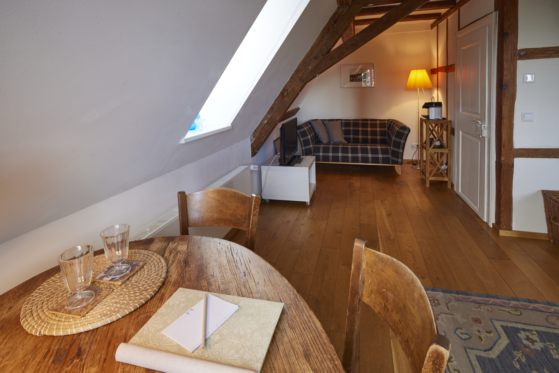 Das Atelier ist das Licht durchflutete große Gästezimmer im Dachgeschoß mit vielen Dachgauben, uralten Holzbalken und Ausblicken über bunte Dächer und Landschaft. Lust auf Lesen? Auf der gleichen Etage ist unsere Bibliothek, wo Sie es sich auch gemütlich machen können.