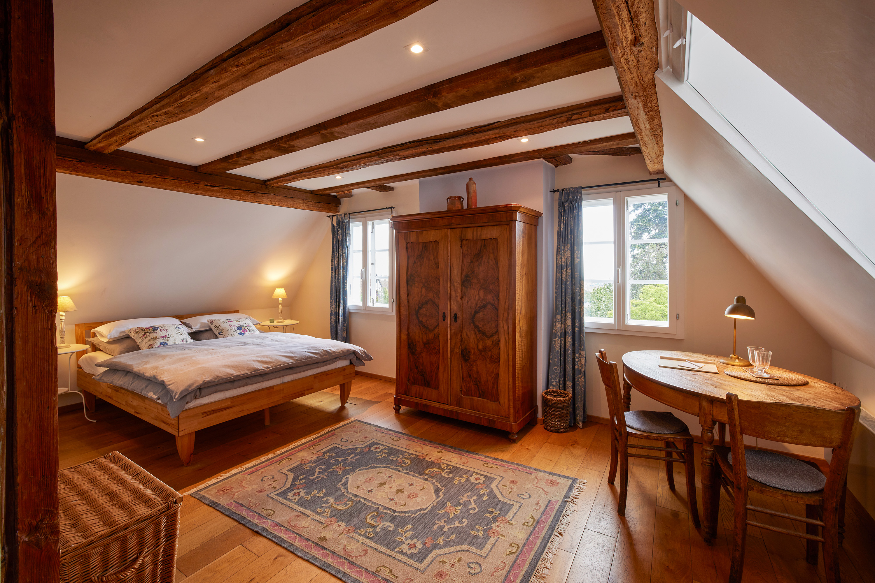 Les Roses ist ihr Rückzugsort im Dachgeschoss. Der Blick von hier ganz oben aus dem Fenster in den Paradiesgarten, über die Weinberge und die Rheinebene ist einfach grandios. Und morgens können Sie den Sonnenaufgang erleben.