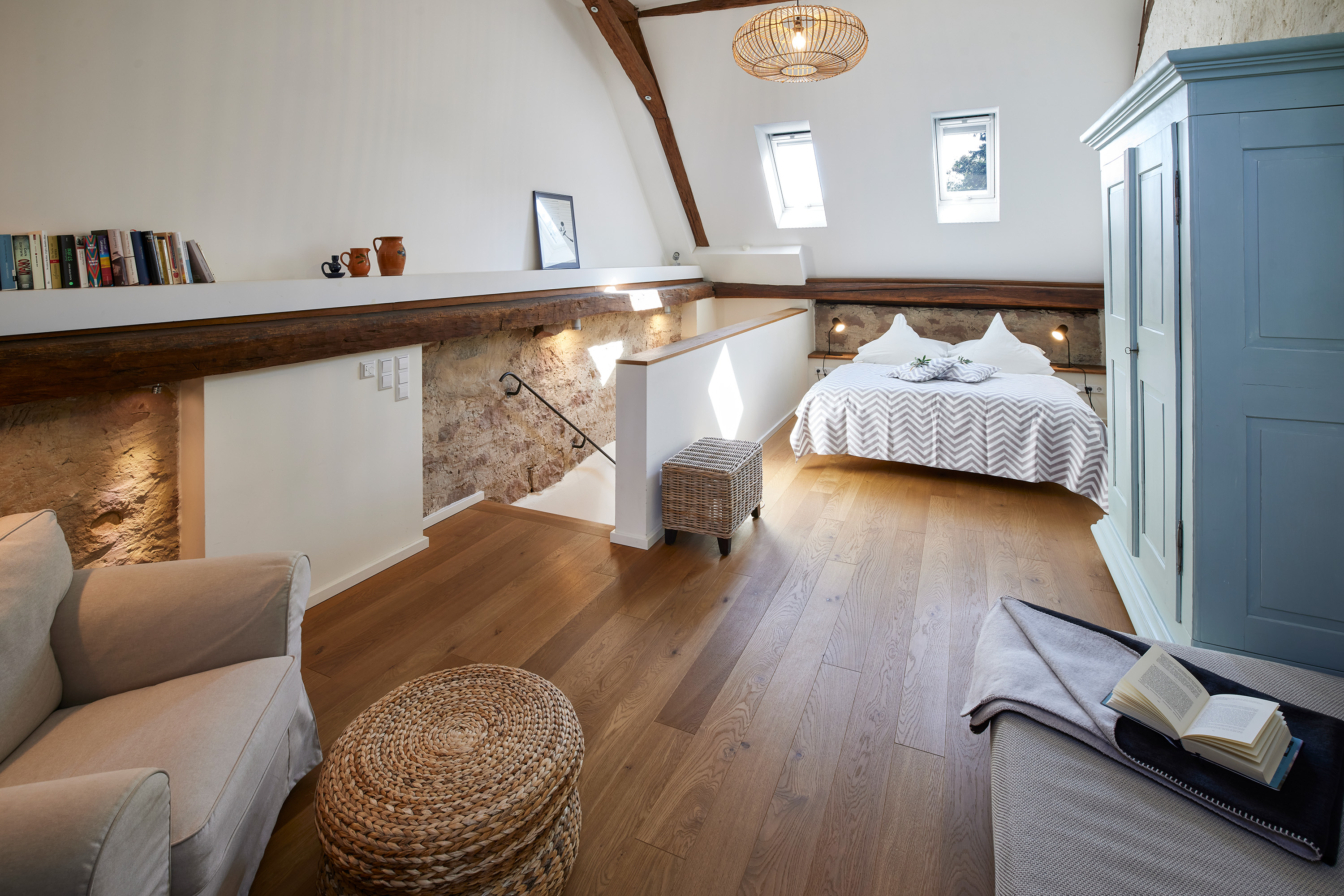 Auf der ersten Etage betreten Sie durch die türkisfarbene Holztür das Apartment. Machen Sie es sich im Sessel und auf der Couch erst einmal bequem. Entdecken Sie weiter oben die Schlafgalerie, wo Sie den Blick aus den Dachfenstern auf Sterne und die Sankt Annakapelle geniessen können.
