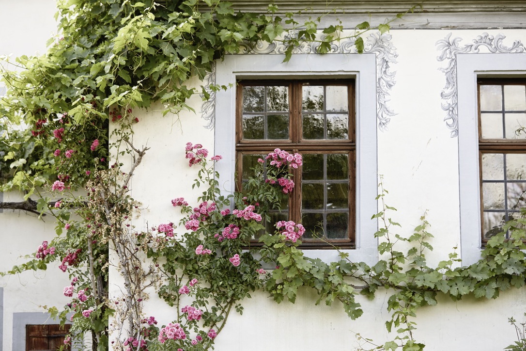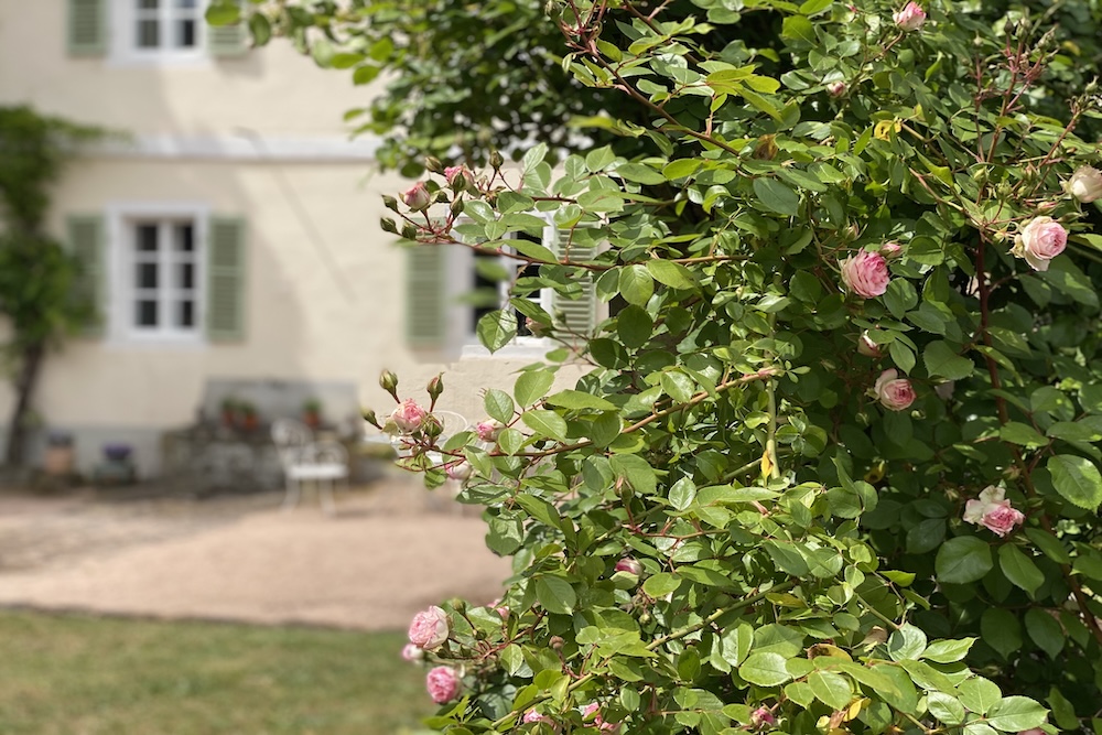 Das weiße Gartentor ist geöffnet, der Blick weitet sich und lädt ein zum Spazieren im historischen französischen Bürgergarten, durch verschlungene Wege und Weinlaubengänge, vorbei am Gartenhaus und zum Wasserbassin, wo nach langem Dornröschenschlaf endlich wieder die Fontaine sprudelt. Und dazu der unendliche Blick in die Weite über das Rebenmeer bis ins Rheintal.