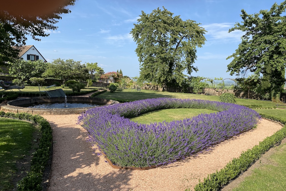 „Eine Mischung aus alter Gartenkunst mit dem schattigen, feucht-staubigen Duft, wie ein Auftritt einer alten Dame mit dem Duft von Lavendel, zusammen mit dem ewig Frischen der Blumen und Gräser, der Sträucher und Bäume. Und dazu der unendliche Blick in die Weite, ins Rheintal. Ein uralter, ehrwürdiger Garten.“