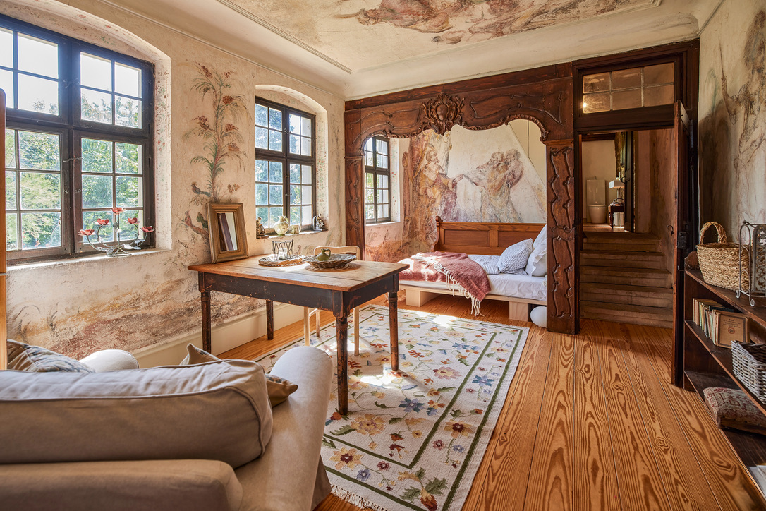 Die noch original erhaltenen Fensterscheiben mit Bleiverglasung umrahmt von Roncaille-Malerei machen neugierig auf das Innere des Gartenhauses, dessen Wände und Decken vollständig in Secco-Fresko-Malerei dekoriert sind - es ist einzigartig. Im Hauptraum finden sich lebensgroße Rokokoszenen der Kindheit Jesu. Der aufwendig geschnitzte Bettalkoven diente an heißen Sommertagen zur Siesta.