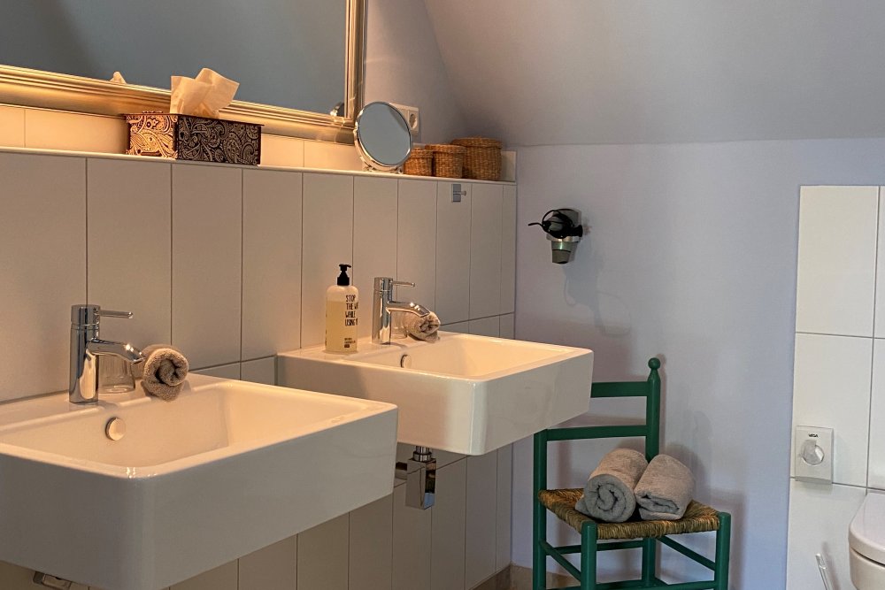 Bad mit Walk-In-Dusche, Doppelwaschbecken, WC, Fön, Kosmetikspiegel, Wäschekorb, Hand- und Duschtücher, Badkosmetik von stop-the-water-while-using-me, Toilettenpapier