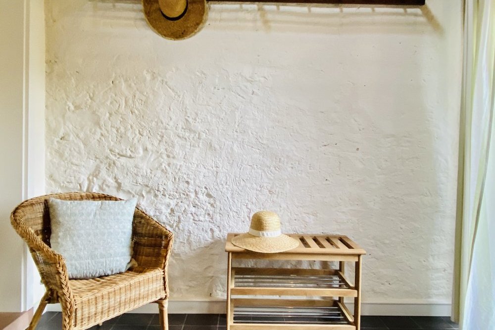 Entrée. antikerGarderobenschrank, Schuhregal, Korbsessel