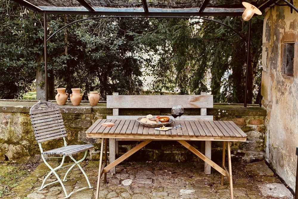 Im Frühjahr verzaubern die prächtigen zartrosa Blüten der Tulpenmagnolie den Remisenhof. Hier unter dem Blätterdach zu sitzen ist einfach herrlich, man hat alles im Blick – das Haus, den Hof und den Garten. Von hier aus gelangen Sie durch das weiße Holztor in den Jardin.