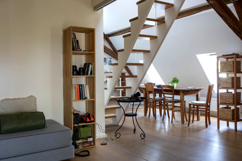 Auf der ersten Etage betreten Sie durch die türkisfarbene Holztür das Apartment. Machen Sie es sich im Sessel und auf der Couch erst einmal bequem. Entdecken Sie weiter oben die Schlafgalerie, wo Sie den Blick aus den Dachfenstern auf Sterne und die Sankt Annakapelle geniessen können.