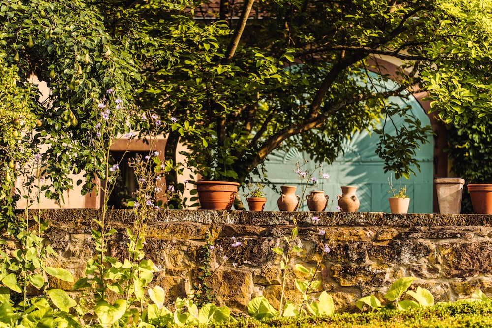 Vor der Eingangstür überragt die herrliche Tulpenmagnolie den Remisenhof. Der Platz lädt ein, bei Morgensonne genau hier den Frühstückstisch zu decken oder mit einer Tasse Kaffee auf der Mauer zu sitzen und ins verwunschene Wäldchen zu blicken.